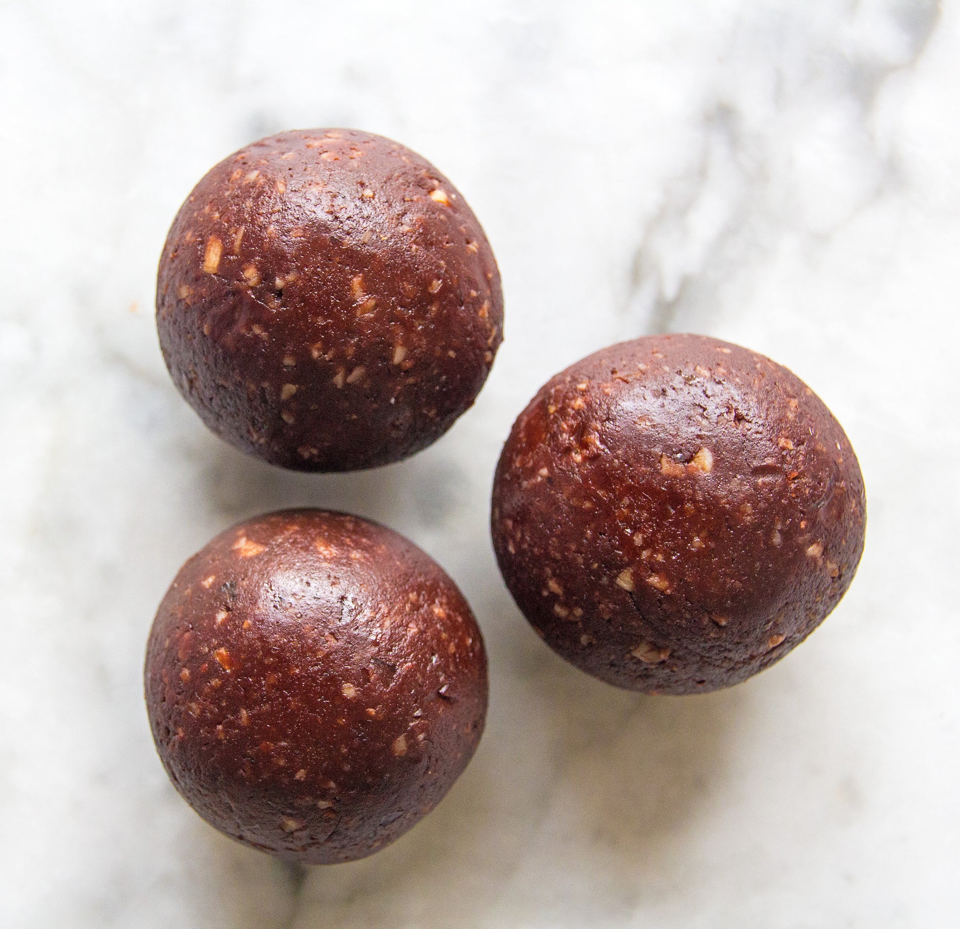 Dates, Whole almonds, Cacao, Roasted almond butter, Coconut oil, Salt