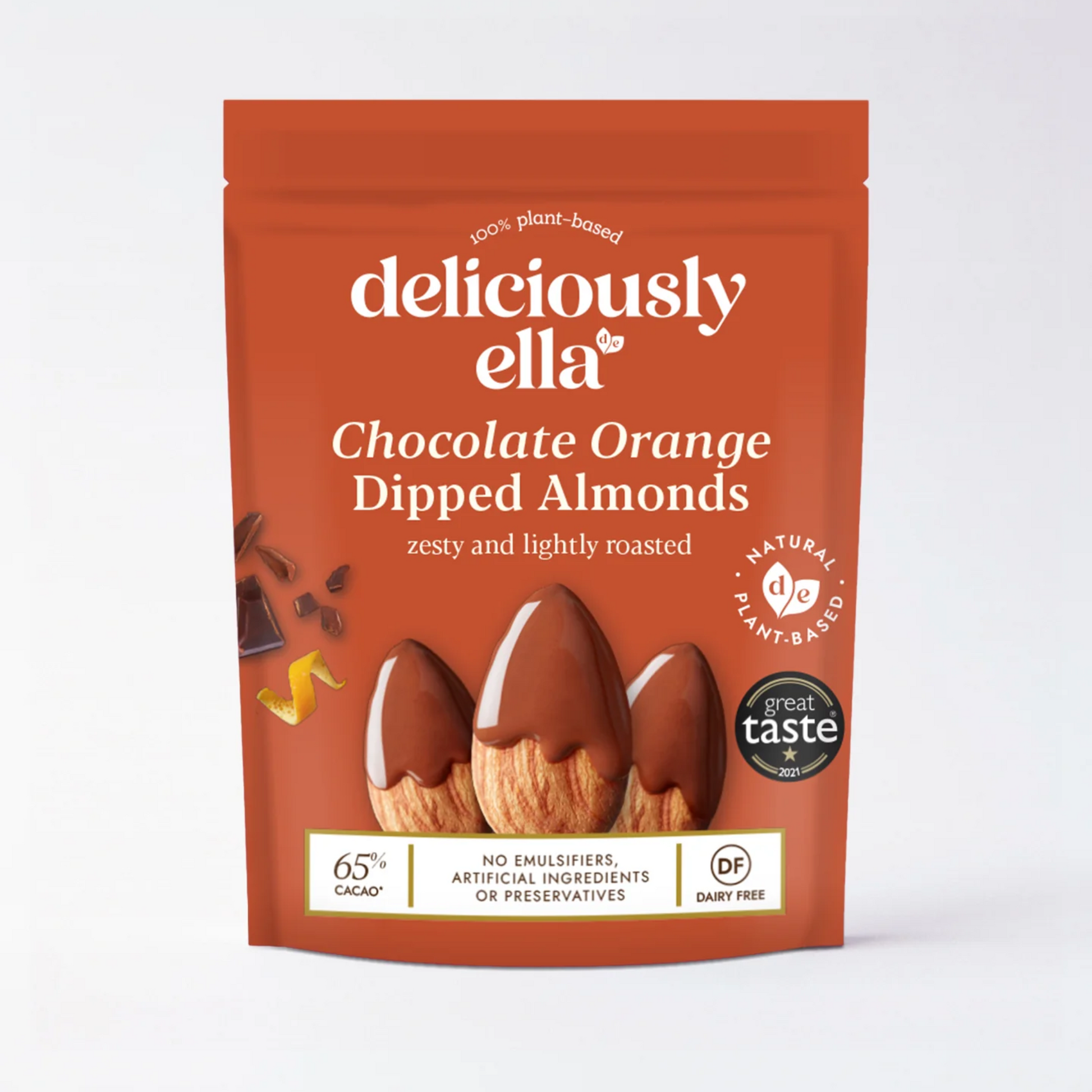 The Chocolate Orange Dipped Almonds contain crunchy roasted almonds that are lightly dipped in irresistible 65% vegan dark chocolate mixed with a zesty hint of orange to create a Delicious high-fibre snack.