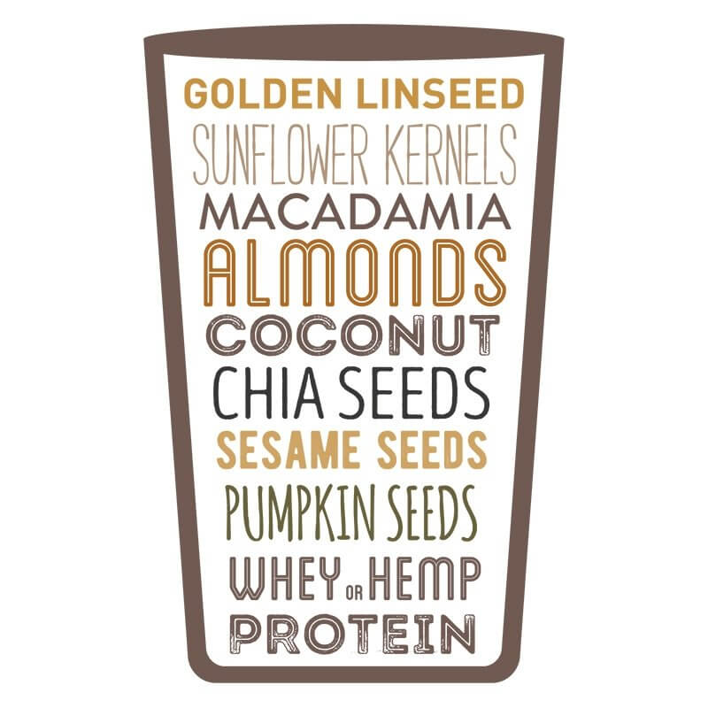 Whey Protein Isolate MILK, Golden linseed (flax), Sunflower Kernels, ALMONDS, Coconut (sulfate free) (15%), Chia Seeds, SESAME Seeds, Pumpkin Seeds, Nutritional Yeast (B-vits), Psyllium Husk (fibre), Apple Pectin (fibre), Steviol Glycosides (Stevia)