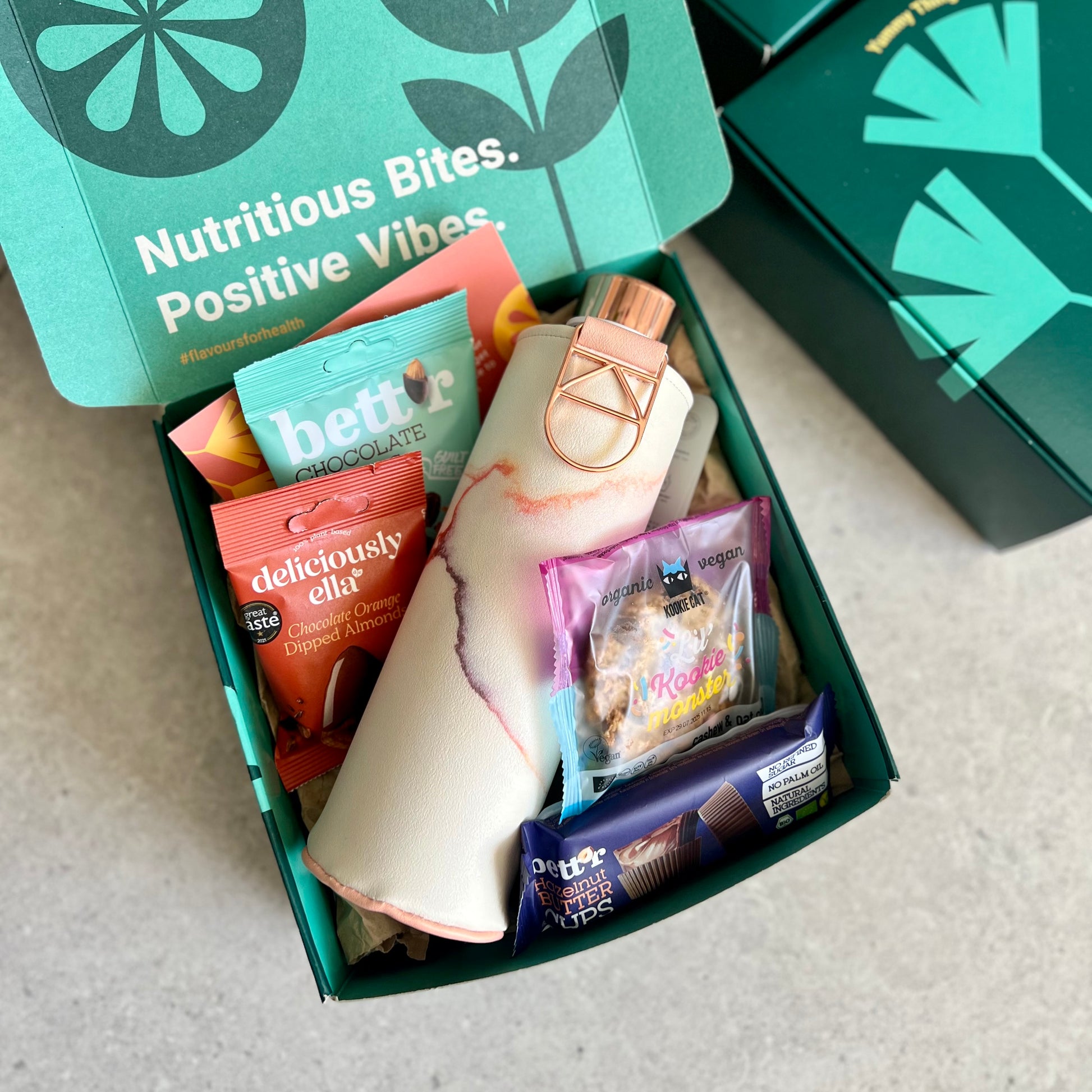 We handpicked a couple of our delicious snacks and paired them with the most beautiful EQUA Mismatch water bottle to create one unique gift box.